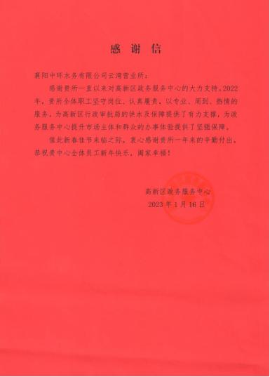 1月20日,襄陽中環(huán)水務(wù)有限公司云灣營業(yè)所收到來自高新區(qū)政務(wù)服務(wù)中心的感謝信,信中對云灣營業(yè)所2022年展現(xiàn)出的責任擔當,以及沖鋒在前、聞令而動的優(yōu)質(zhì)供水服務(wù)給予充分肯定與高度認可。